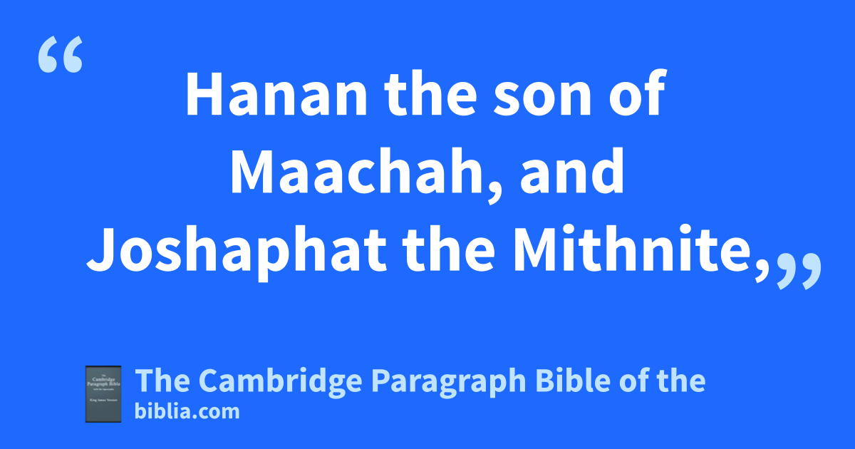 26 Also othe valiant men of the armies were, Asahel the brother of Joab, Elhanan the son of Dodo of Beth-lehem, 27 * Shammoth the * Harorite, Helez pthe * Pelonite, 28 Ira the son of Ikkesh the Tekoite, Abi-ezer qthe Antothite, 29 r* Sibbecai the Hushathite, * Ilai the Ahohite, 30 Maharai the Netophathite, * Heled the son of Baanah the Netophathite, 31 Ithai the son of Ribai of Gibeah, that pertained to the children of Benjamin, Benaiah the Pirathonite, 32 * Hurai of the brooks of Gaash, * Abiel the Arbathite, 33 Azmaveth the Baharumite, Eliahba the Shaalbonite, 34 the sons of * Hashem the Gizonite, Jonathan the son of Shage the Hararite, 35 Ahiam the son of * Sacar the Hararite, * Eliphal the son of * Ur, 36 Hepher sthe Mecherathite, Ahijah the pPelonite, 37 * Hezro the Carmelite, * Naarai the son of Ezbai, 38 Joel the brother of Nathan, Mibhar * the son of Haggeri, 39 Zelek the Ammonite, Naharai the Berothite, the armourbearer of Joab the son of Zeruiah, 40 Ira the Ithrite, Gareb the Ithrite, 41 Uriah the Hittite, tZabad the son of Ahlai, 42 Adina the son of Shiza the Reubenite, a captain of the Reubenites, and thirty with him, 43 Hanan the son of Maachah, and Joshaphat the Mithnite, 44 Uzzia the uAshterathite, Shama and Jehiel the sons of Hothan the xAroerite, 45 Jediael the * son of Shimri, and Joha his brother, the Tizite, 46 Eliel the Mahavite, and Jeribai, and Joshaviah, the sons of Elnaam, and Ithmah the Moabite, 47 Eliel, and Obed, and Jasiel the Mesobaite.