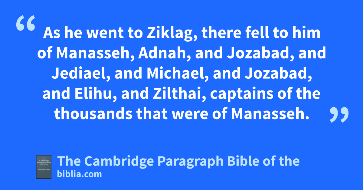 XII. * Now athese are they that came to David to Ziklag, * while he yet kept himself close because of Saul the son of Kish: and they were among the mighty men, helpers of the war. 2 They were barmed with bows, and could use both the right hand and cthe left in hurling stones and shooting arrows out of a bow, even of Saul’s brethren of Benjamin. 3 The chief was Ahiezer, then Joash, the sons of * Shemaah the dGibeathite; and Jeziel, and Pelet, the sons of Azmaveth; and Berachah, and Jehu the eAntothite, 4 and Ismaiah the fGibeonite, a mighty man among the thirty, and over the thirty; and Jeremiah, and Jahaziel, and Johanan, and Josabad the gGederathite, 5 Eleuzai, and Jerimoth, and Bealiah, and Shemariah, and Shephatiah the Haruphite, 6 Elkanah, and Jesiah, and Azareel, and Joezer, and Jashobeam, the hKorhites, 7 and Joelah, and Zebadiah, the sons of Jeroham of iGedor. 8 And of the Gadites there separated themselves unto David into the hold to the wilderness men of might, and men * of war fit for the battle, that could handle shield and jbuckler, whose faces were like the faces of lions, and kwere * as swift as the roes upon the mountains: 9 Ezer the first, Obadiah the second, Eliab the third, 10 Mishmannah the fourth, Jeremiah the fifth, 11 Attai the sixth, Eliel the seventh, 12 Johanan the eighth, Elzabad the ninth, 13 Jeremiah the tenth, Machbanai the eleventh. 14 These were of the sons of Gad, captains of the host: * one of the least was over an hundred, and the greatest over a thousand. 15 These are they that went over Jordan in lthe first month, when it had * overflown all his banks; and they put to flight all them of the valleys, both toward the east, and toward the west. 16 And there came of the children of Benjamin and Judah to the hold unto David. 17 And David went out * to meet them, and manswered and said unto them, If ye be come peaceably unto me to help me, mine heart shall * be knit unto you: but if ye be come to betray me to mine enemies, seeing there is no * wrong in mine hands, the God of our fathers look thereon, and nrebuke it. 18 Then * the spirit came upon oAmasai, who was chief of the captains, and he said,