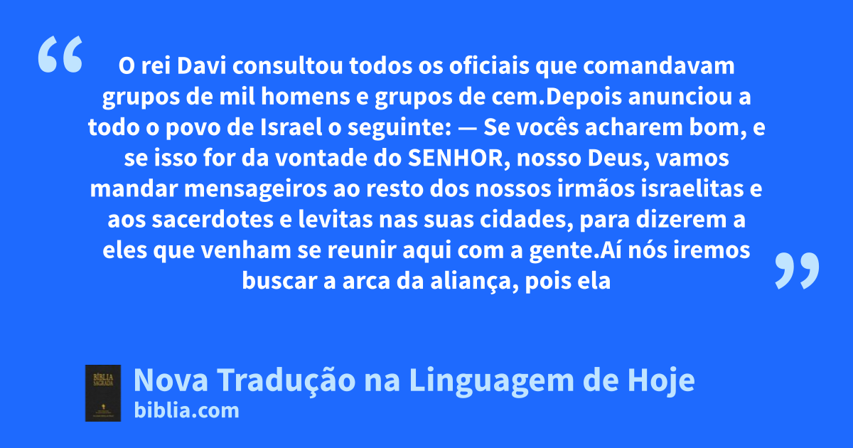 — Se vocês acharem bom, e se isso for da vontade do Senhor, nosso Deus, vamos mandar mensageiros ao resto dos nossos irmãos israelitas e aos sacerdotes e * levitas nas suas cidades, para dizerem a eles que venham se reunir aqui com a gente.3 Aí nós iremos buscar a * arca da aliança, pois ela ficou esquecida durante o reinado de Saul.
