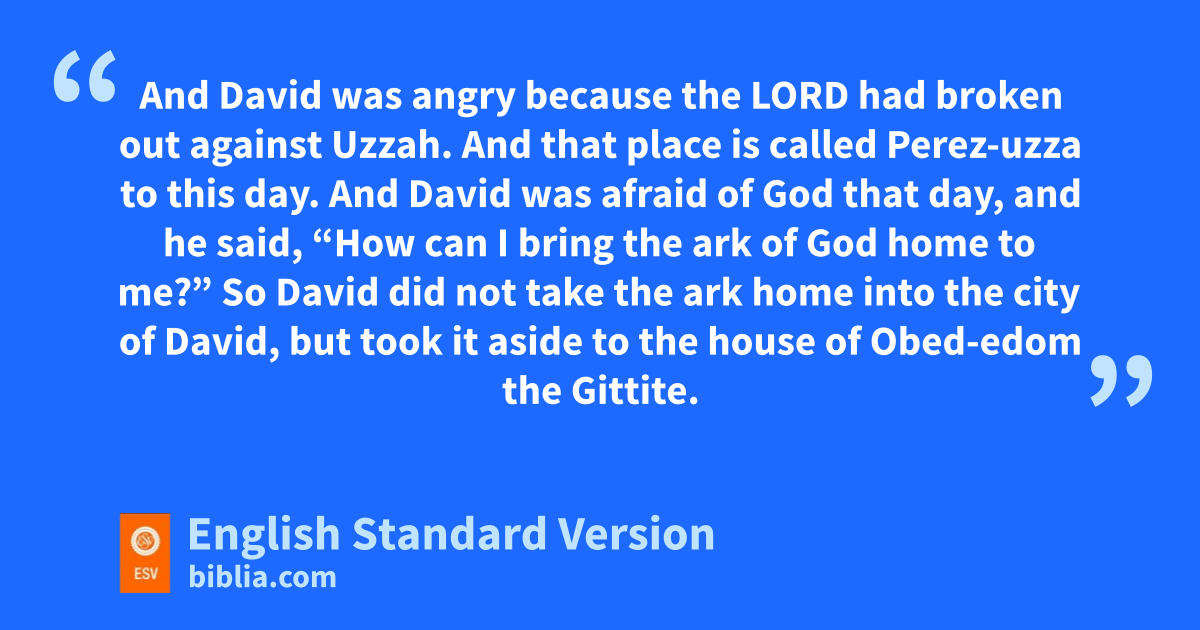 9 And when they came to the threshing floor of oChidon, Uzzah put out his hand to take hold of the ark, for the oxen stumbled. 10 And the anger of the Lord was kindled against Uzzah, and he struck him down pbecause he put out his hand to the ark, and qhe died there before God. 11 And David was angry because the Lord had broken out against Uzzah. And that place is called Perez-uzza4 to this day. 12 And David was afraid of God that day, and he said, “How can I bring the ark of God home to me?” 13 So David did not take the ark home into the city of David, but took it aside to the house rof Obed-edom the Gittite. 14 And the ark of God remained with the household of Obed-edom in his house three months. sAnd the Lord blessed the household of Obed-edom and all that he had.