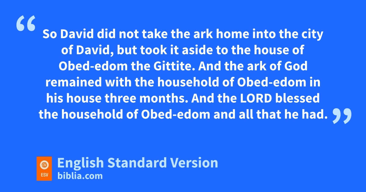 9 And when they came to the threshing floor of oChidon, Uzzah put out his hand to take hold of the ark, for the oxen stumbled. 10 And the anger of the Lord was kindled against Uzzah, and he struck him down pbecause he put out his hand to the ark, and qhe died there before God. 11 And David was angry because the Lord had broken out against Uzzah. And that place is called Perez-uzza4 to this day. 12 And David was afraid of God that day, and he said, “How can I bring the ark of God home to me?” 13 So David did not take the ark home into the city of David, but took it aside to the house rof Obed-edom the Gittite. 14 And the ark of God remained with the household of Obed-edom in his house three months. sAnd the Lord blessed the household of Obed-edom and all that he had.