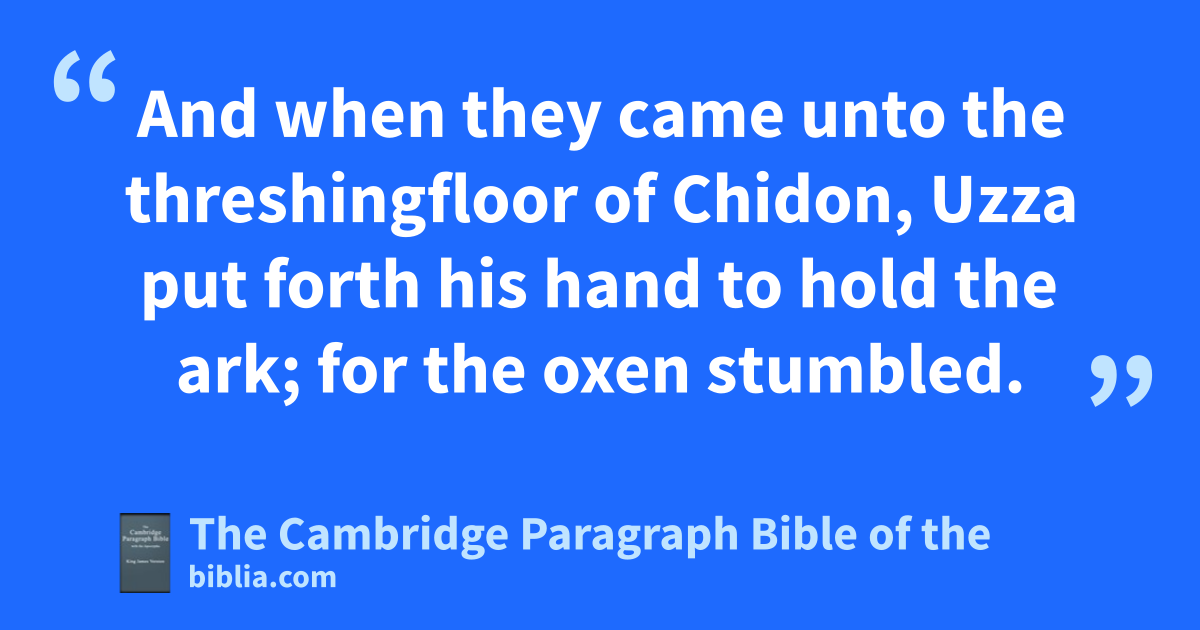 XIII. * And David consulted with the captains of thousands and hundreds, and with every leader. 2 And David said unto all the congregation of Israel, If it seem good unto you, and that it be of the Lord our God, * let us send abroad unto our brethren every where, that are aleft in all the land of Israel, and with them also to the priests and Levites which are * in their cities and suburbs, that they may gather themselves unto us: 3 and let us * bring again the ark of our God to us: for bwe inquired not at it in the days of Saul. 4 And all the congregation said that they would do so: for the thing was right in the eyes of all the people. 5 So cDavid gathered all Israel together, from dShihor of Egypt even eunto the entering of Hemath, to bring the ark of God from fKirjath-jearim. 6 gAnd David went up, and all Israel, to hBaalah, that is, to Kirjath-jearim, which belonged to Judah, to bring up thence the ark of God the Lord, that dwelleth between the cherubims, whose name is called ion it. 7 And they * carried the ark of God in a new cart out of the house of Abinadab: and Uzza and Ahio drave the cart. 8 And David and all Israel played before God with all their might, and with * singing, and with kharps, and with kpsalteries, and with timbrels, and with kcymbals, and with trumpets. 9 And when they came unto the threshingfloor of * Chidon, Uzza put forth his hand to hold the ark; for the oxen * stumbled. 10 And the anger of the Lord was kindled against Uzza, and he smote him, because he put his hand to the ark: and there he ldied before God. 11 And David was displeased, because the Lord had made a breach upon Uzza: wherefore that place is called * Perez-uzza to this day. 12 And David was afraid of God that day, saying, How shall I bring the ark of God home to me? 13 So David * brought not the ark home to himself to the city of David, but carried it aside into the house of Obed-edom the Gittite. 14 And the ark of God remained with the family of Obed-edom in his house three months. And the Lord mblessed the house of Obed-edom, and all that he had.