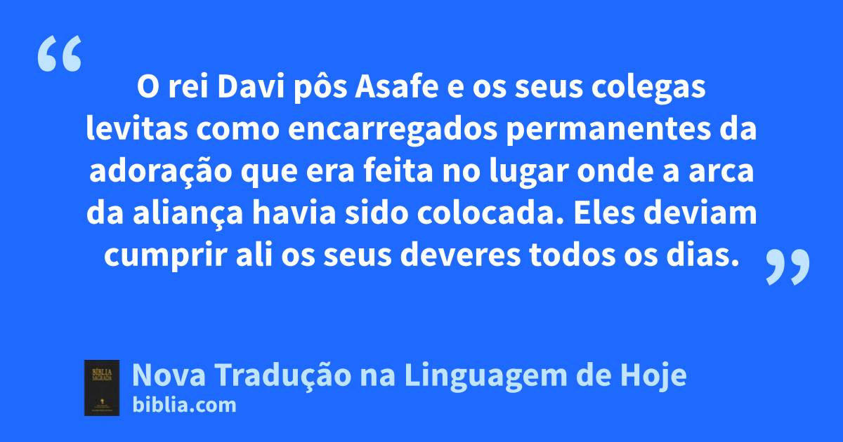 4 Davi nomeou alguns * levitas para dirigirem a adoração ao Senhor, o Deus de Israel, cantando e louvando a Deus, em frente da arca da aliança.5 Asafe foi nomeado o chefe deles, e Zacarias, o seu ajudante. Para tocarem * lira, foram nomeados: Jeiel, Semiramote, Jeiel, Matitias, Eliabe, Benaías, Obede-Edom e Jeiel. Para tocar pratos, foi nomeado Asafe,6 e, para tocarem trombeta todos os dias em frente da arca da aliança, foram nomeados os sacerdotes Benaías e Jaaziel.7 Foi nesse dia que Davi deu pela primeira vez a Asafe e aos seus colegas levitas a responsabilidade de cantarem louvores a Deus, o Senhor.