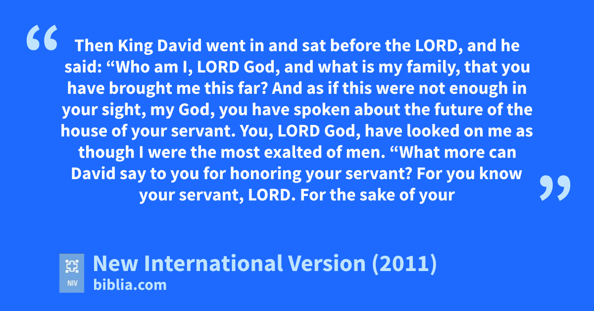“Who am I, Lord God, and what is my family, that you have brought me this far? 17 And as if this were not enough in your sight, my God, you have spoken about the future of the house of your servant. You, Lord God, have looked on me as though I were the most exalted of men.
