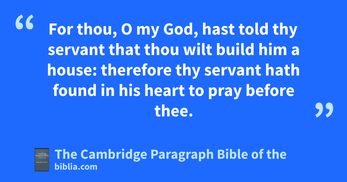 XVII. Now ait came to pass, as David sat in his house, that David said to Nathan the prophet, Lo, I dwell in a house of cedars, but the ark of the covenant of the Lord remaineth under curtains. 2 Then Nathan said unto David, Do all that is in thine heart; for God is with thee. 3 And it came to pass the same night, that the word of God came to Nathan, saying, 4 Go and tell David my servant, Thus saith the Lord, Thou shalt not build me a house to dwell in: 5 for I have not dwelt in a house since the day that I brought up Israel unto this day; but * have gone from tent to tent, and from one tabernacle to another. 6 Wheresoever I have walked with all Israel, spake I a word to any of the bjudges of Israel, whom I commanded to feed my people, saying, Why have ye not built me a house of cedars? 7 Now therefore thus shalt thou say unto my servant David, Thus saith the Lord of hosts, I took thee from the sheepcote, even * from following the sheep, that thou shouldest be ruler over my people Israel: 8 and I have been with thee whithersoever thou hast walked, and have cut off all thine enemies from before thee, and have made thee a name like the name of the great men that are in the earth. 9 Also I will ordain a place for my people Israel, and will plant them, and they shall dwell in their place, and shall be moved no more; neither shall the children of wickedness cwaste them any more, as at the beginning, 10 and since the time that I commanded judges to be over my people Israel. Moreover I will subdue all thine enemies. Furthermore I tell thee that the Lord will build thee a house. 11 And it shall come to pass, when thy days be expired that thou must go to be with thy fathers, that I will raise up thy seed after thee, which shall be of thy sons; and I will stablish his kingdom. 12 He shall build me a house, and I will stablish his throne for ever. 13 dI will be his father, and he shall be my son: and I will not take my mercy away from him, as I took it from ehim that was before thee: 14 But I will settle him in mine house and in my kingdom for ever: and his throne shall be established for evermore. 15 According to all these words, and according to all this vision, so did Nathan speak unto David.