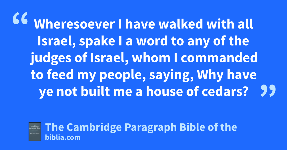 XVII. Now ait came to pass, as David sat in his house, that David said to Nathan the prophet, Lo, I dwell in a house of cedars, but the ark of the covenant of the Lord remaineth under curtains. 2 Then Nathan said unto David, Do all that is in thine heart; for God is with thee. 3 And it came to pass the same night, that the word of God came to Nathan, saying, 4 Go and tell David my servant, Thus saith the Lord, Thou shalt not build me a house to dwell in: 5 for I have not dwelt in a house since the day that I brought up Israel unto this day; but * have gone from tent to tent, and from one tabernacle to another. 6 Wheresoever I have walked with all Israel, spake I a word to any of the bjudges of Israel, whom I commanded to feed my people, saying, Why have ye not built me a house of cedars? 7 Now therefore thus shalt thou say unto my servant David, Thus saith the Lord of hosts, I took thee from the sheepcote, even * from following the sheep, that thou shouldest be ruler over my people Israel: 8 and I have been with thee whithersoever thou hast walked, and have cut off all thine enemies from before thee, and have made thee a name like the name of the great men that are in the earth. 9 Also I will ordain a place for my people Israel, and will plant them, and they shall dwell in their place, and shall be moved no more; neither shall the children of wickedness cwaste them any more, as at the beginning, 10 and since the time that I commanded judges to be over my people Israel. Moreover I will subdue all thine enemies. Furthermore I tell thee that the Lord will build thee a house. 11 And it shall come to pass, when thy days be expired that thou must go to be with thy fathers, that I will raise up thy seed after thee, which shall be of thy sons; and I will stablish his kingdom. 12 He shall build me a house, and I will stablish his throne for ever. 13 dI will be his father, and he shall be my son: and I will not take my mercy away from him, as I took it from ehim that was before thee: 14 But I will settle him in mine house and in my kingdom for ever: and his throne shall be established for evermore. 15 According to all these words, and according to all this vision, so did Nathan speak unto David.