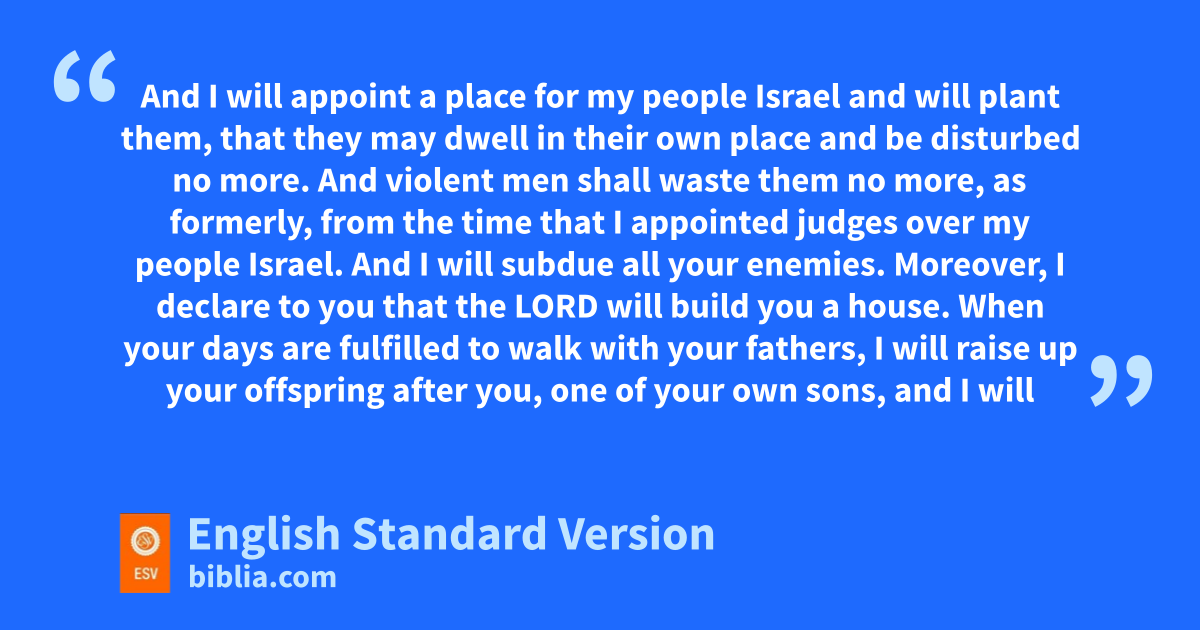 3 But that same night the word of the Lord came to Nathan, 4 “Go and tell my servant David, ‘Thus says the Lord: uIt is not you who will build me a house to dwell in. 5 For I have not lived in a house since the day I brought up Israel to this day, vbut I have gone from tent to tent and from dwelling to dwelling. 6 In all places where I have moved with all Israel, did I speak a word with any of the judges of Israel, whom I commanded to shepherd my people, saying, “Why have you not built me a house of cedar?” ’ 7 Now, therefore, thus shall you say to my servant David, ‘Thus says the Lord of hosts, I took you from the pasture, from following the sheep, to be prince over my people Israel, 8 and I have been with you wherever you have gone and have cut off all your enemies from before you. And I will make for you a name, like the name of the great ones of the earth. 9 And I will appoint a place for my people Israel and will plant them, that they may dwell in their own place and be disturbed no more. And violent men shall waste them no more, as formerly, 10 from the time that I appointed judges over my people Israel. And I wwill subdue all your enemies. Moreover, I declare to you that the Lord will build you a house. 11 When your days are fulfilled to walk with your fathers, I will raise up your offspring after you, one of your own sons, and I will establish his kingdom. 12 He shall build a house for me, and I will establish his throne forever. 13 xI will be to him a father, and he shall be to me a son. I will not take my steadfast love from him, yas I took it from him who was before you, 14 but I will confirm him in my house and in my kingdom forever, and his throne shall be established forever.’ ” 15 In accordance with all these words, and in accordance with all this vision, Nathan spoke to David.