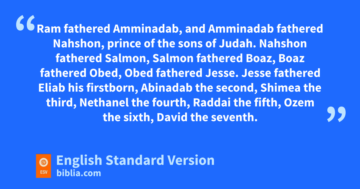 9 The sons of Hezron that were born to him: Jerahmeel, gRam, and hChelubai. 10 gRam fathered Amminadab, and iAmminadab fathered jNahshon, prince of the sons of Judah. 11 Nahshon fathered kSalmon,2 Salmon fathered lBoaz, 12 Boaz fathered Obed, lObed fathered Jesse. 13 mJesse fathered Eliab his firstborn, Abinadab the second, nShimea the third, 14 Nethanel the fourth, Raddai the fifth, 15 Ozem the sixth, oDavid the seventh. 16 And their sisters were Zeruiah and Abigail. pThe sons of Zeruiah: Abishai, Joab, and Asahel, three. 17 qAbigail bore Amasa, and the father of Amasa was qJether the Ishmaelite.