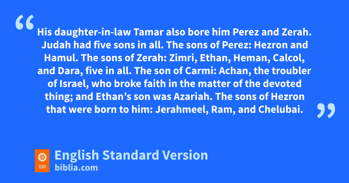 5 The esons of Perez: Hezron and Hamul. 6 The sons of Zerah: Zimri, Ethan, Heman, Calcol, and Dara, five in all. 7 The son1 of Carmi: Achan, the troubler of Israel, who fbroke faith in the matter of the devoted thing; 8 and Ethan’s son was Azariah.