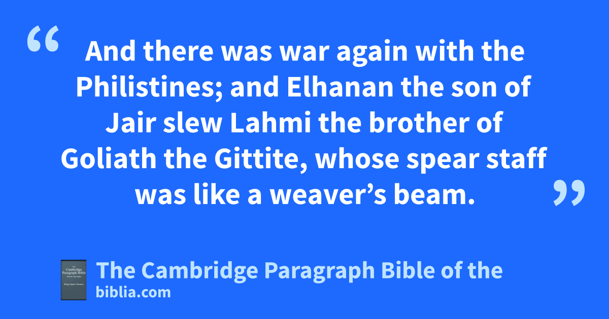 4 eAnd it came to pass after this, that there * arose war at f* Gezer with the Philistines; at which time Sibbechai the Hushathite slew * Sippai, that was of the children of * the giant: and they were subdued. 5 And there was war again with the Philistines; and Elhanan the son of * Jair slew Lahmi the brother of Goliath the Gittite, whose spear staff was like a weaver’s beam. 6 And yet again there was war at Gath, where was * a man of great stature, whose fingers and toes were four and twenty, six on each hand, and six on each foot: and he also was * the son of the giant. 7 But when he * defied Israel, Jonathan the son of * Shimea David’s brother slew him. 8 These were born unto the giant in Gath; and they fell by the hand of David, and by the hand of his servants.