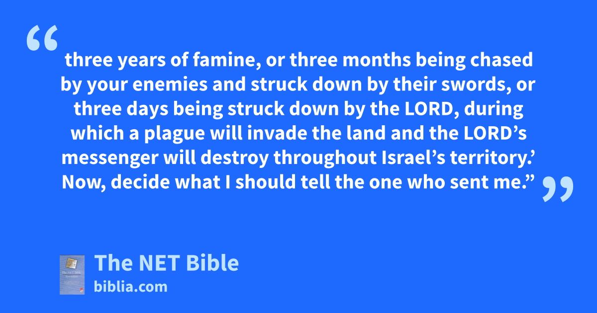 21:8 David said to God, “I have sinned greatly by doing this! Now, please remove the guilt of your servant, for I have acted very foolishly.” 21:9 The Lord told Gad, David’s prophet,16 21:10 “Go, tell David, ‘This is what the Lord says: “I am offering you three forms of judgment from which to choose. Pick one of them.” ’ ”17 21:11 Gad went to David and told him, “This is what the Lord says: ‘Pick one of these: 21:12 three18 years of famine, or three months being chased by your enemies and struck down by their swords,19 or three days being struck down by the Lord, during which a plague will invade the land and the Lord’s messenger will destroy throughout Israel’s territory.’20 Now, decide what I should tell the one who sent me.” 21:13 David said to Gad, “I am very upset! I prefer to be attacked by the Lord, for his mercy is very great; I do not want to be attacked by men!”21 21:14 So the Lord sent a plague through Israel, and 70,000 Israelite men died.