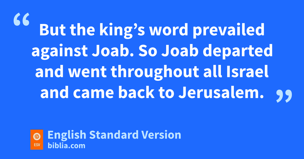 21 fThen gSatan stood against Israel and incited David to number Israel. 2 So David said to Joab and the commanders of the army, “Go, number Israel, from Beersheba to Dan, and bring me a report, that I may know their number.” 3 But Joab said, “May the Lord add to his people a hundred times as many as they are! Are they not, my lord the king, all of them my lord’s servants? Why then should my lord require this? Why should it be a cause of guilt for Israel?” 4 But the king’s word prevailed against Joab. So Joab departed and went throughout all Israel and came back to Jerusalem. 5 And Joab gave the sum of the numbering of the people to David. In all Israel there were h1,100,000 men who drew the sword, and in Judah h470,000 who drew the sword. 6 iBut he did not include Levi and Benjamin in the numbering, for the king’s command was abhorrent to Joab.