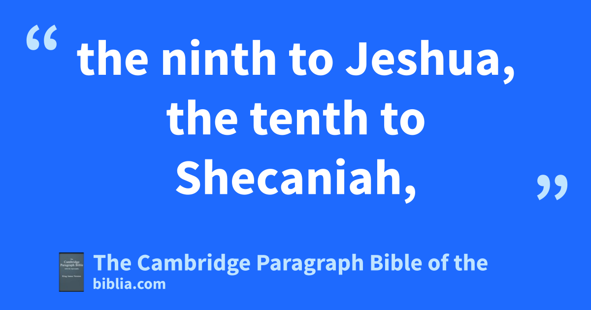 XXIV. Now these are the divisions of the sons of Aaron. aThe sons of Aaron; Nadab, and Abihu, Eleazar, and Ithamar. 2 But bNadab and Abihu died before their father, and had no children: therefore Eleazar and Ithamar executed the priest’s office. 3 And David distributed them, both cZadok of the sons of Eleazar, and cAhimelech of the sons of Ithamar, according to their offices in their service. 4 And there were moe chief men found of the sons of Eleazar than of the sons of Ithamar: and thus were they divided. Among the sons of Eleazar there were sixteen chief men dof the house of their fathers, and eight among the sons of Ithamar daccording to the house of their fathers. 5 Thus were they divided by elot, one sort with another; for the governors of the sanctuary, and governors of the house of God, were of the sons of Eleazar, and of the sons of Ithamar. 6 And Shemaiah the son of Nethaneel the scribe, one of the Levites, wrote them before the king, and the princes, and cZadok the priest, and cAhimelech the son of fAbiathar, and before the chief of the fathers of the priests and Levites: one * principal household being taken for Eleazar, and one taken for Ithamar. 7 Now the first lot came forth to gJehoiarib, the second to hJedaiah, 8 the third to hHarim, the fourth to Seorim, 9 the fifth to iMalchijah, the sixth to Mijamin, 10 the seventh to Hakkoz, the eighth to jAbijah, 11 the ninth to Jeshua, the tenth to Shecaniah, 12 the eleventh to Eliashib, the twelfth to Jakim, 13 the thirteenth to Huppah, the fourteenth to Jeshebeab, 14 the fifteenth to Bilgah, the sixteenth to hImmer, 15 the seventeenth to Hezir, the eighteenth to Aphses, 16 the nineteenth to Pethahiah, the twentieth to Jehezekel, 17 the one and twentieth to Jachin, the two and twentieth to Gamul, 18 the three and twentieth to Delaiah, the four and twentieth to Maaziah. 19 These were the orderings of them in their service kto come into the house of the Lord, according to their manner, under Aaron their father, as the Lord God of Israel had commanded him.
