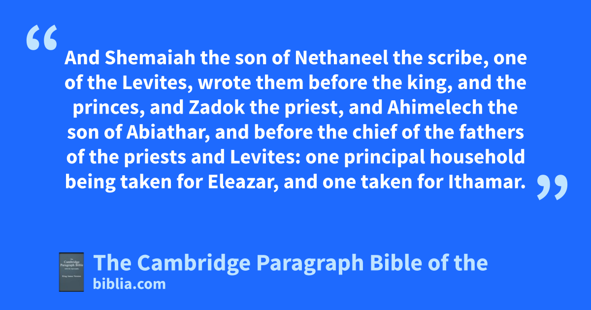 XXIV. Now these are the divisions of the sons of Aaron. aThe sons of Aaron; Nadab, and Abihu, Eleazar, and Ithamar. 2 But bNadab and Abihu died before their father, and had no children: therefore Eleazar and Ithamar executed the priest’s office. 3 And David distributed them, both cZadok of the sons of Eleazar, and cAhimelech of the sons of Ithamar, according to their offices in their service. 4 And there were moe chief men found of the sons of Eleazar than of the sons of Ithamar: and thus were they divided. Among the sons of Eleazar there were sixteen chief men dof the house of their fathers, and eight among the sons of Ithamar daccording to the house of their fathers. 5 Thus were they divided by elot, one sort with another; for the governors of the sanctuary, and governors of the house of God, were of the sons of Eleazar, and of the sons of Ithamar. 6 And Shemaiah the son of Nethaneel the scribe, one of the Levites, wrote them before the king, and the princes, and cZadok the priest, and cAhimelech the son of fAbiathar, and before the chief of the fathers of the priests and Levites: one * principal household being taken for Eleazar, and one taken for Ithamar. 7 Now the first lot came forth to gJehoiarib, the second to hJedaiah, 8 the third to hHarim, the fourth to Seorim, 9 the fifth to iMalchijah, the sixth to Mijamin, 10 the seventh to Hakkoz, the eighth to jAbijah, 11 the ninth to Jeshua, the tenth to Shecaniah, 12 the eleventh to Eliashib, the twelfth to Jakim, 13 the thirteenth to Huppah, the fourteenth to Jeshebeab, 14 the fifteenth to Bilgah, the sixteenth to hImmer, 15 the seventeenth to Hezir, the eighteenth to Aphses, 16 the nineteenth to Pethahiah, the twentieth to Jehezekel, 17 the one and twentieth to Jachin, the two and twentieth to Gamul, 18 the three and twentieth to Delaiah, the four and twentieth to Maaziah. 19 These were the orderings of them in their service kto come into the house of the Lord, according to their manner, under Aaron their father, as the Lord God of Israel had commanded him.