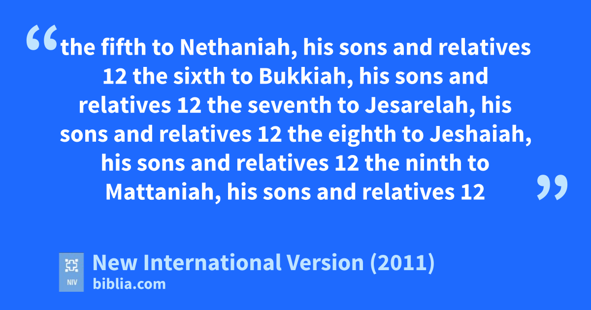 25 David, together with the commanders of the army, set apart some of the sons of Asaph,g Hemanh and Jeduthuni for the ministry of prophesying,j accompanied by harps, lyres and cymbals.k Here is the list of the menl who performed this service:m