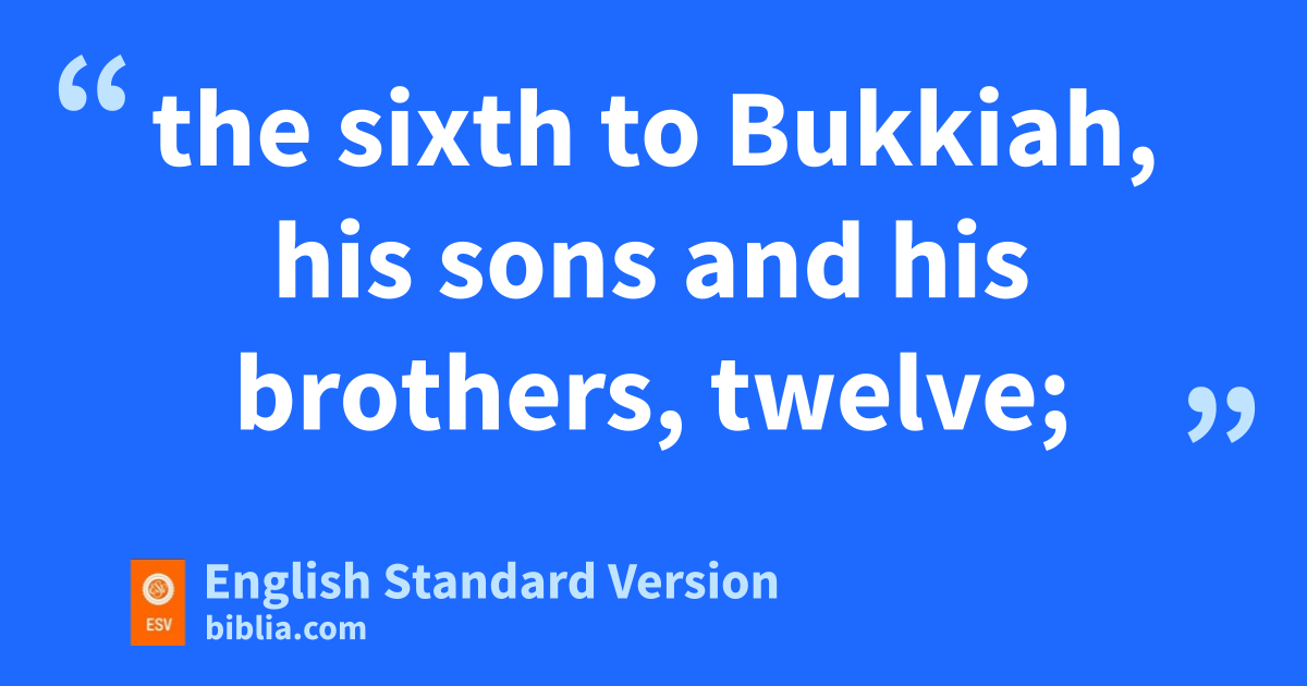 9 The first lot fell for Asaph to Joseph; the second to Gedaliah, to him and his brothers and his sons, twelve; 10 the third to Zaccur, his sons and his brothers, twelve; 11 the fourth to Izri, his sons and his brothers, twelve; 12 the fifth to Nethaniah, his sons and his brothers, twelve; 13 the sixth to Bukkiah, his sons and his brothers, twelve; 14 the seventh to Jesharelah, his sons and his brothers, twelve; 15 the eighth to Jeshaiah, his sons and his brothers, twelve; 16 the ninth to Mattaniah, his sons and his brothers, twelve; 17 the tenth to Shimei, his sons and his brothers, twelve; 18 the eleventh to Azarel, his sons and his brothers, twelve; 19 the twelfth to Hashabiah, his sons and his brothers, twelve; 20 to the thirteenth, Shubael, his sons and his brothers, twelve; 21 to the fourteenth, Mattithiah, his sons and his brothers, twelve; 22 to the fifteenth, to Jeremoth, his sons and his brothers, twelve; 23 to the sixteenth, to Hananiah, his sons and his brothers, twelve; 24 to the seventeenth, to Joshbekashah, his sons and his brothers, twelve; 25 to the eighteenth, to Hanani, his sons and his brothers, twelve; 26 to the nineteenth, to Mallothi, his sons and his brothers, twelve; 27 to the twentieth, to Eliathah, his sons and his brothers, twelve; 28 to the twenty-first, to Hothir, his sons and his brothers, twelve; 29 to the twenty-second, to Giddalti, his sons and his brothers, twelve; 30 to the twenty-third, to Mahazioth, his sons and his brothers, twelve; 31 to the twenty-fourth, to Romamti-ezer, his sons and his brothers, twelve.