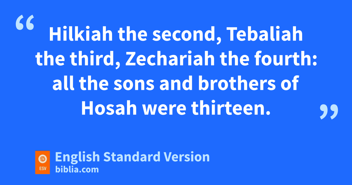26 As for the divisions of the gatekeepers: of the Korahites, Meshelemiah the son of Kore, of the sons of Asaph. 2 And Meshelemiah had sons: gZechariah the firstborn, Jediael the second, Zebadiah the third, Jathniel the fourth, 3 Elam the fifth, Jehohanan the sixth, Eliehoenai the seventh. 4 And hObed-edom had sons: Shemaiah the firstborn, Jehozabad the second, Joah the third, Sachar the fourth, Nethanel the fifth, 5 Ammiel the sixth, Issachar the seventh, Peullethai the eighth, ifor God blessed him. 6 Also to his son Shemaiah were sons born who were rulers in their fathers’ houses, for they were men of great ability. 7 The sons of Shemaiah: Othni, Rephael, Obed and Elzabad, whose brothers were able men, Elihu and Semachiah. 8 All these were of the sons of Obed-edom with their sons and brothers, able men qualified for the service; sixty-two of Obed-edom. 9 And Meshelemiah had sons and brothers, able men, eighteen. 10 And jHosah, of the sons of Merari, had sons: Shimri the chief (for though he was not the firstborn, his father made him chief), 11 Hilkiah the second, Tebaliah the third, Zechariah the fourth: all the sons and brothers of Hosah were thirteen.