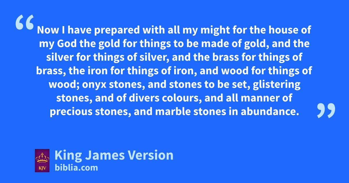 29 *Furthermore David the king said unto all the congregation, Solomon my son, whom alone God hath chosen, is yet ayoung and tender, and the work is great: for the bpalace is not for man, but for the Lord God. 2 Now I have prepared with all my might for the house of my God the gold for things to be made of gold, and the silver for things of silver, and the brass for things of brass, the iron for things of iron, and wood for things of wood; conyx stones, and stones dto be set, eglistering stones, and fof divers colours, and all manner of precious stones, and gmarble stones in abundance. 3 Moreover, because I have set my affection to the house of my God, I have of mine own proper good, of gold and silver, which I have given to the house of my God, over and above all that I have prepared for the holy house, 4 Even hthree thousand talents of gold, of the gold of iOphir, and seven thousand talents of jrefined silver, to overlay the walls of the houses withal: 5 The gold for things of gold, and the silver for things of silver, and for all manner of work to be made by the hands of artificers. And who then is willing †to consecrate his service this day unto the Lord?