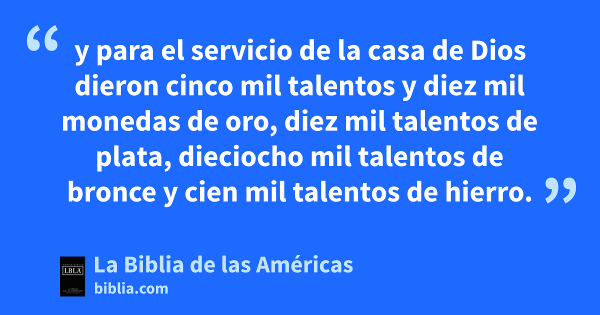 7 y para el servicio de la casa de Dios dieron cinco mil talentos y diez mil monedas1 de oroa, diez mil talentos de plata, dieciocho mil talentos de bronce y cien mil talentos de hierro.