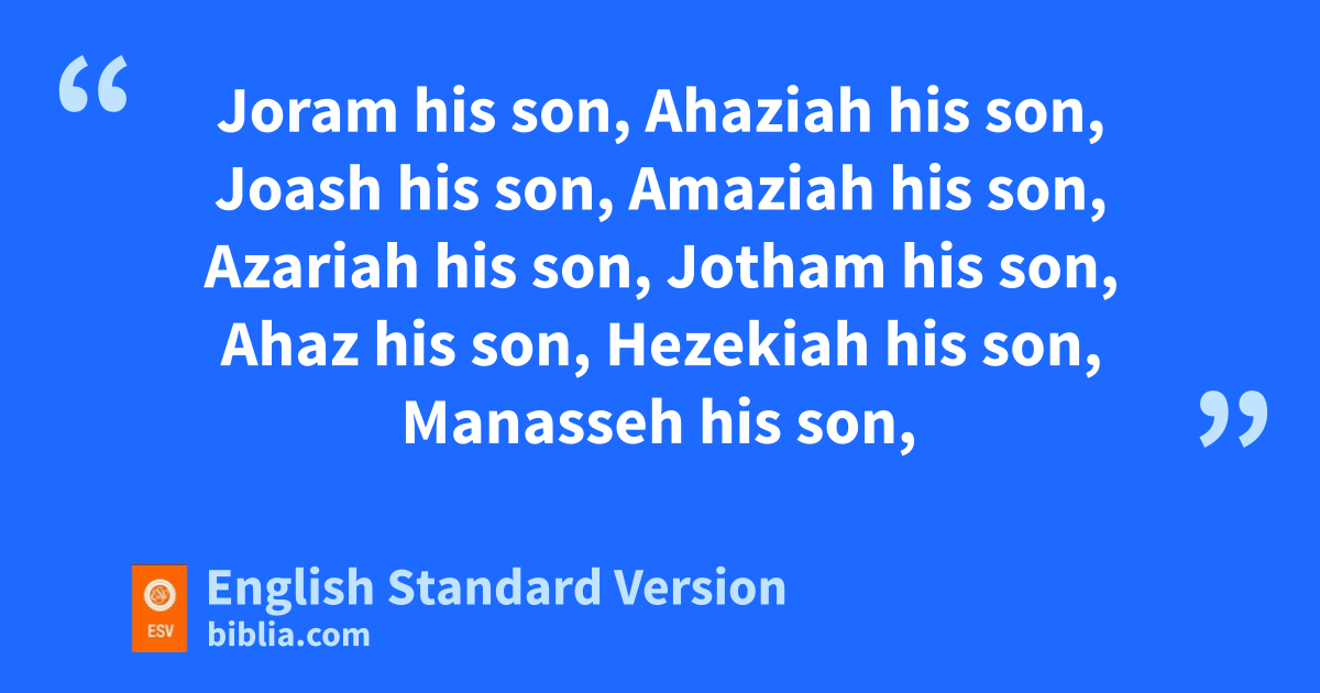 10 The son of Solomon was yRehoboam, zAbijah his son, aAsa his son, bJehoshaphat his son, 11 cJoram his son, dAhaziah his son, eJoash his son, 12 fAmaziah his son, gAzariah his son, hJotham his son, 13 iAhaz his son, jHezekiah his son, kManasseh his son, 14 lAmon his son, mJosiah his son. 15 The sons of Josiah: nJohanan the firstborn, the second oJehoiakim, the third pZedekiah, the fourth Shallum. 16 The descendants of qJehoiakim: rJeconiah his son, sZedekiah his son; 17 and the sons of Jeconiah, the tcaptive: uShealtiel his son, 18 Malchiram, Pedaiah, Shenazzar, Jekamiah, Hoshama and Nedabiah; 19 and the sons of Pedaiah: vZerubbabel and Shimei; and the sons of vZerubbabel: Meshullam and Hananiah, and Shelomith was their sister; 20 and Hashubah, Ohel, Berechiah, Hasadiah, and Jushab-hesed, five. 21 The sons of Hananiah: Pelatiah and Jeshaiah, his son1 Rephaiah, his son Arnan, his son Obadiah, his son Shecaniah. 22 The son2 of Shecaniah: wShemaiah. And the sons of Shemaiah: xHattush, Igal, Bariah, Neariah, and Shaphat, six. 23 The sons of Neariah: Elioenai, Hizkiah, and Azrikam, three. 24 The sons of Elioenai: Hodaviah, Eliashib, Pelaiah, Akkub, Johanan, Delaiah, and Anani, seven.
