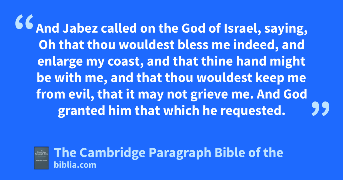 9 And iJabez was kmore honourable than his brethren: and his mother called his name * Jabez, saying, Because I bare him with lsorrow. 10 And Jabez called on the God of Israel, saying, * Oh that thou wouldest bless me indeed, and enlarge my coast, and that thine hand might be with me, and that thou wouldest * keep me from evil, that it may not grieve me. And God granted him that which he requested.