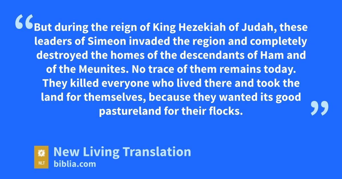 Some of Ham’s descendants had been living in that region. 41 But during the reign of King Hezekiah of Judah, these leaders of Simeon invaded the region and completely destroyed* the homes of the descendants of Ham and of the Meunites. No trace of them remains today. They killed everyone who lived there and took the land for themselves, because they wanted its good pastureland for their flocks. 42 Five hundred of these invaders from the tribe of Simeon went to Mount Seir, led by Pelatiah, Neariah, Rephaiah, and Uzziel—all sons of Ishi. 43 They destroyed the few Amalekites who had survived, and they have lived there ever since.