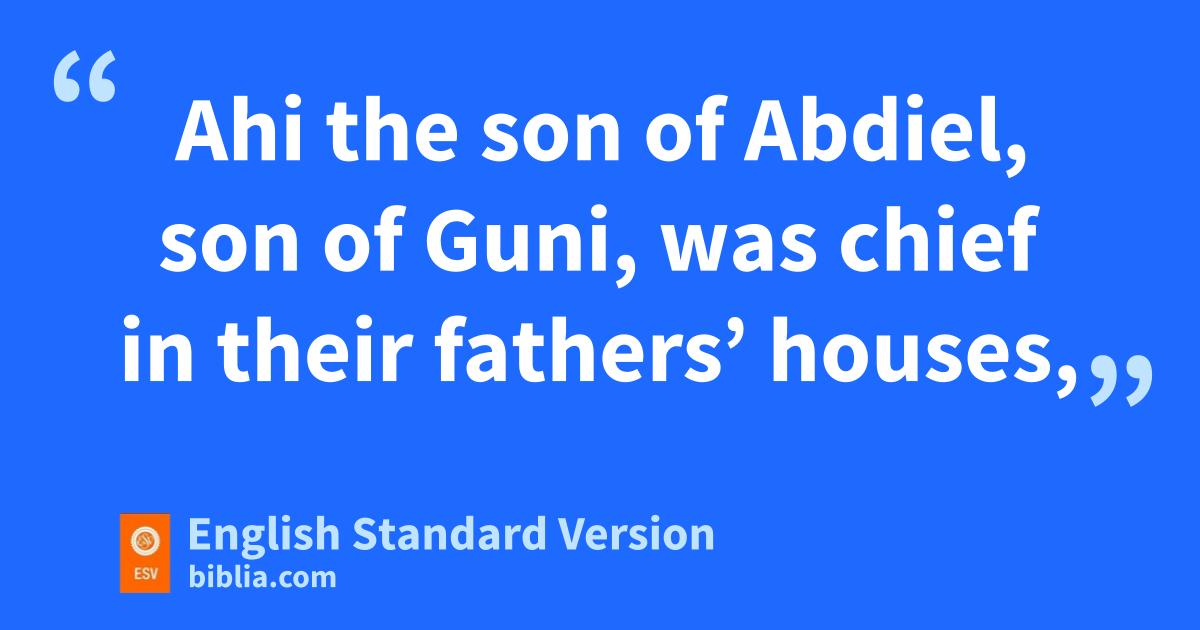 11 The sons of Gad lived over against them in the land of Bashan as far as qSalecah: 12 Joel the chief, Shapham the second, Janai, and Shaphat in Bashan. 13 And their kinsmen according to their fathers’ houses: Michael, Meshullam, Sheba, Jorai, Jacan, Zia and Eber, seven. 14 These were the sons of Abihail the son of Huri, son of Jaroah, son of Gilead, son of Michael, son of Jeshishai, son of Jahdo, son of Buz. 15 Ahi the son of Abdiel, son of Guni, was chief in their fathers’ houses, 16 and they lived in Gilead, in Bashan and in its towns, and in all the pasturelands of rSharon to their limits. 17 All of these were recorded in genealogies in the days of sJotham king of Judah, and in the days of tJeroboam king of Israel.