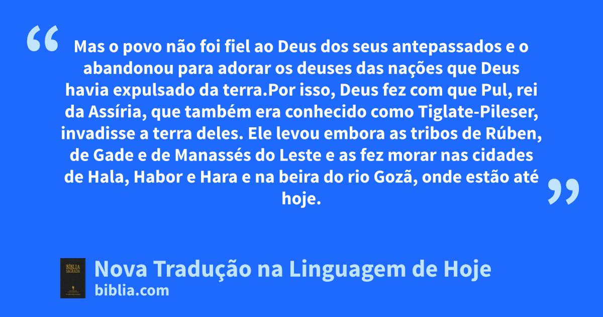 25 Mas o povo não foi fiel ao Deus dos seus antepassados e o abandonou para adorar os deuses das nações que Deus havia expulsado da terra.26 Por isso, Deus fez com que Pul, rei da Assíria, que também era conhecido como Tiglate-Pileser, invadisse a terra deles. Ele levou embora as * tribos de Rúben, de Gade e de Manassés do Leste e as fez morar nas cidades de Hala, Habor e Hara e na beira do rio Gozã, onde estão * até hoje.8