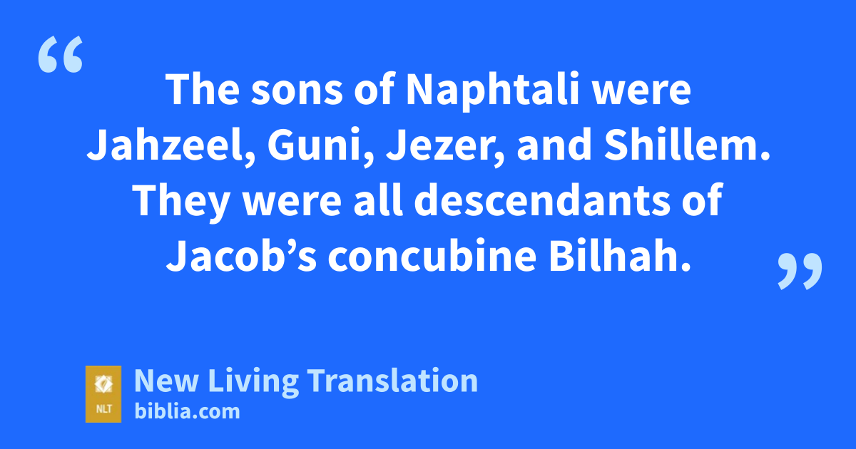13 The sons of Naphtali were Jahzeel,* Guni, Jezer, and Shillem.* They were all descendants of Jacob’s concubine Bilhah.