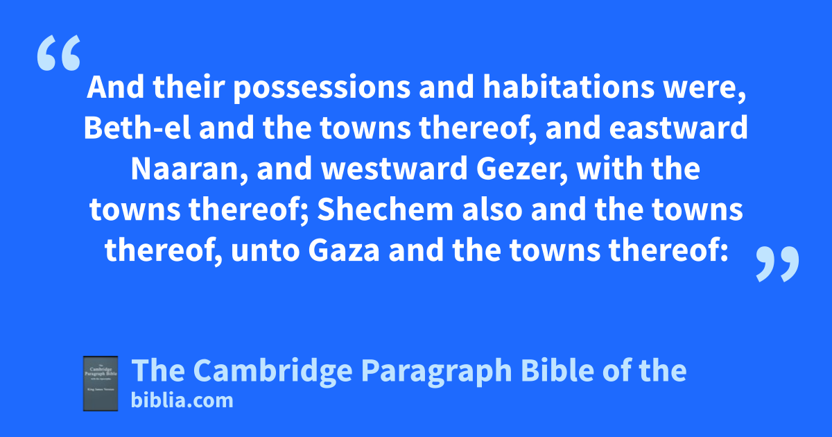 28 And their possessions and habitations were, rBeth-el and the * towns thereof, and eastward * Naaran, and westward sGezer, with the * towns thereof; Shechem also and the * towns thereof, * unto Gaza and the * towns thereof: 29 tand by the borders of the children of Manasseh, Beth-shean and her * towns, Taanach and her * towns, Megiddo and her * towns, Dor and her * towns. In these dwelt the children of Joseph the son of Israel.