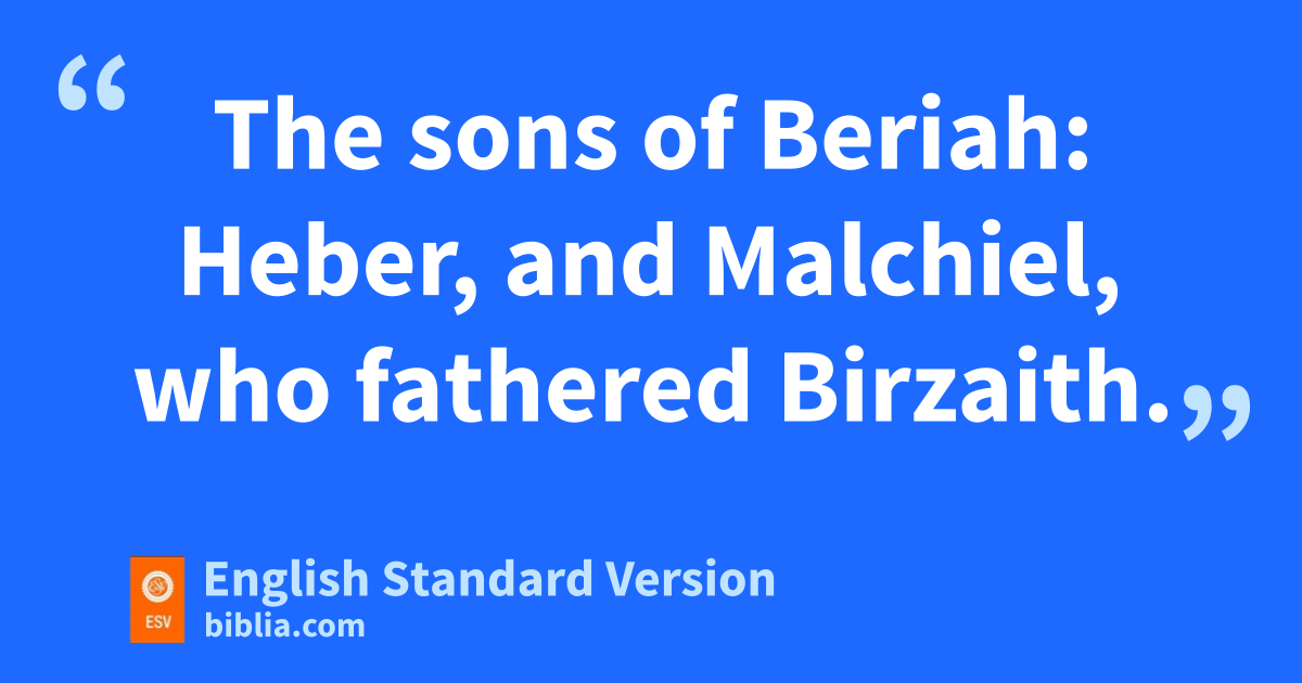 30 dThe sons of Asher: Imnah, Ishvah, Ishvi, Beriah, and their sister Serah. 31 The sons of Beriah: Heber, and Malchiel, who fathered Birzaith. 32 Heber fathered Japhlet, Shomer, Hotham, and their sister Shua. 33 The sons of Japhlet: Pasach, Bimhal, and Ashvath. These are the sons of Japhlet. 34 The sons of Shemer his brother: Rohgah, Jehubbah, and Aram. 35 The sons of Helem his brother: Zophah, Imna, Shelesh, and Amal. 36 The sons of Zophah: Suah, Harnepher, Shual, Beri, Imrah. 37 Bezer, Hod, Shamma, Shilshah, Ithran, and Beera. 38 The sons of Jether: Jephunneh, Pispa, and Ara. 39 The sons of Ulla: Arah, Hanniel, and Rizia. 40 All of these were men of Asher, heads of fathers’ houses, approved, mighty warriors, chiefs of the princes. Their number enrolled by genealogies, for service in war, was 26,000 men.