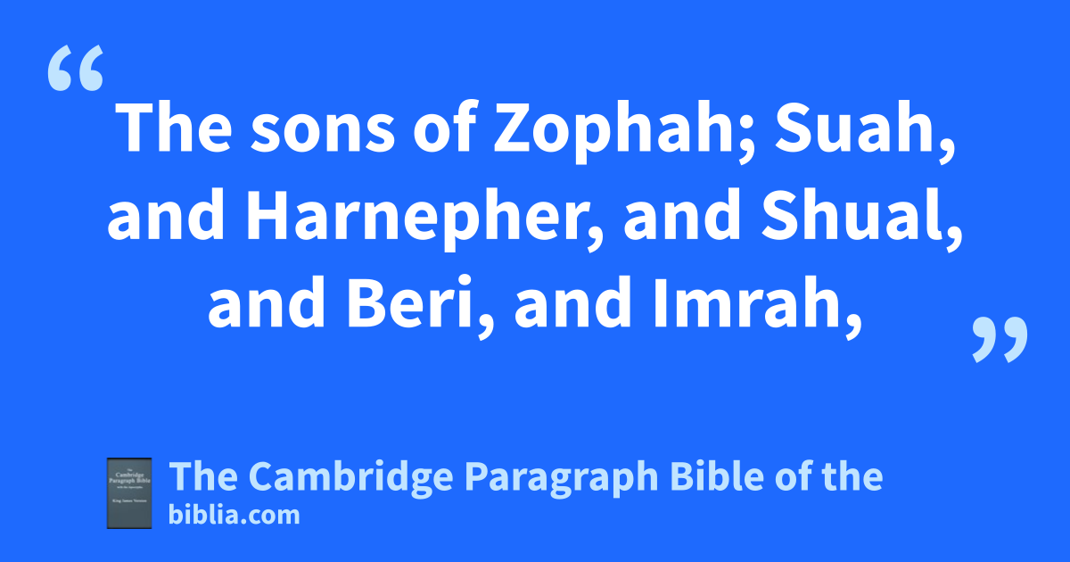 30 The sons of Asher; uImnah, and uIsuah, and uIshuai, and Beriah, and Serah their sister. 31 And the sons of Beriah; Heber, and Malchiel, who is the father of Birzavith. 32 And Heber begat Japhlet, and * Shomer, and Hotham, and Shua their sister. 33 And the sons of Japhlet; Pasach, and Bimhal, and Ashvath. These are the children of Japhlet. 34 And the sons of * Shamer; Ahi, and Rohgah, Jehubbah, and Aram. 35 And the son of his brother Helem; Zophah, and Imna, and Shelesh, and Amal. 36 The sons of Zophah; Suah, and Harnepher, and Shual, and Beri, and Imrah, 37 Bezer, and Hod, and Shamma, and Shilshah, and xIthran, and Beera. 38 And the sons of xJether; Jephunneh, and Pispah, and Ara. 39 And the sons of Ulla; Arah, and Haniel, and Rezia. 40 All these were the children of Asher, heads of their fathers’ house, ychoice and mighty men of valour, chief of the princes. And the number throughout the genealogy of them that were apt to the war and to battle was twenty and six thousand men.