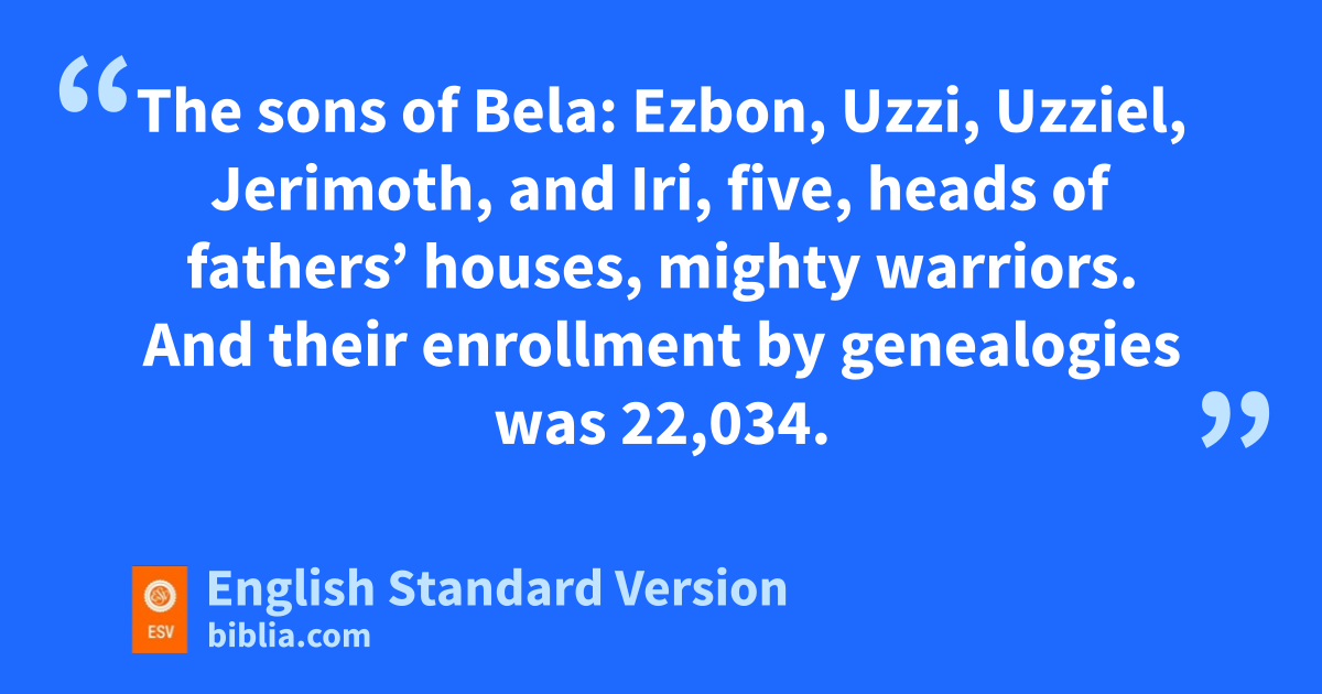 6 lThe sons of Benjamin: Bela, Becher, and Jediael, three. 7 The sons of Bela: Ezbon, Uzzi, Uzziel, Jerimoth, and Iri, five, heads of fathers’ houses, mighty warriors. And their enrollment by genealogies was 22,034. 8 The sons of Becher: Zemirah, Joash, Eliezer, Elioenai, Omri, Jeremoth, Abijah, mAnathoth, and Alemeth. All these were the sons of Becher. 9 And their enrollment by genealogies, according to their generations, as heads of their fathers’ houses, mighty warriors, was 20,200. 10 The son of Jediael: Bilhan. And the sons of Bilhan: Jeush, Benjamin, Ehud, Chenaanah, Zethan, Tarshish, and Ahishahar. 11 All these were the sons of Jediael according to the heads of their fathers’ houses, mighty warriors, 17,200, able to go to war. 12 And Shuppim and Huppim were the sons of Ir, Hushim the son of nAher.