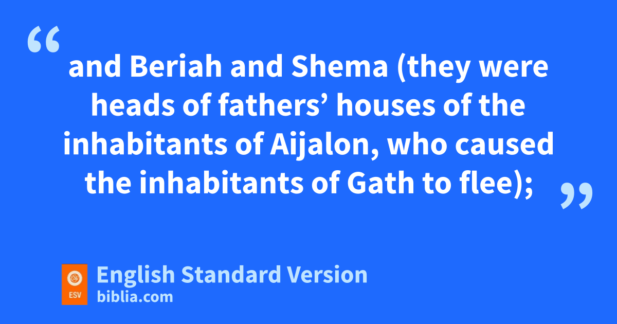 8 eBenjamin fathered Bela his firstborn, Ashbel the second, fAharah the third, 2 Nohah the fourth, and Rapha the fifth. 3 And Bela had sons: Addar, Gera, Abihud, 4 Abishua, gNaaman, Ahoah, 5 Gera, hShephuphan, and Huram. 6 These are the sons of Ehud (they were heads of fathers’ houses of the inhabitants of Geba, and they were carried into exile to iManahath): 7 Naaman,1 Ahijah, and Gera, that is, Heglam, who fathered2 Uzza and Ahihud. 8 And Shaharaim fathered sons in the country of Moab after he had sent away Hushim and Baara his wives. 9 He fathered sons by Hodesh his wife: Jobab, Zibia, Mesha, Malcam, 10 Jeuz, Sachia, and Mirmah. These were his sons, heads of fathers’ houses. 11 He also fathered sons by Hushim: Abitub and Elpaal. 12 The sons of Elpaal: Eber, Misham, and Shemed, who built jOno and kLod with its towns, 13 and Beriah and lShema (they were heads of fathers’ houses of the inhabitants of mAijalon, who caused the inhabitants of Gath to flee); 14 and Ahio, Shashak, and Jeremoth. 15 Zebadiah, Arad, Eder, 16 Michael, Ishpah, and Joha were sons of Beriah. 17 Zebadiah, Meshullam, Hizki, Heber, 18 Ishmerai, Izliah, and Jobab were the sons of Elpaal. 19 Jakim, Zichri, Zabdi, 20 Elienai, Zillethai, Eliel, 21 Adaiah, Beraiah, and Shimrath were the sons of Shimei. 22 Ishpan, Eber, Eliel, 23 Abdon, Zichri, Hanan, 24 Hananiah, Elam, Anthothijah, 25 Iphdeiah, and Penuel were the sons of Shashak. 26 Shamsherai, Shehariah, Athaliah, 27 Jaareshiah, Elijah, and Zichri were the sons of Jeroham. 28 These were the heads of fathers’ houses, according to their generations, chief men. These lived in Jerusalem.