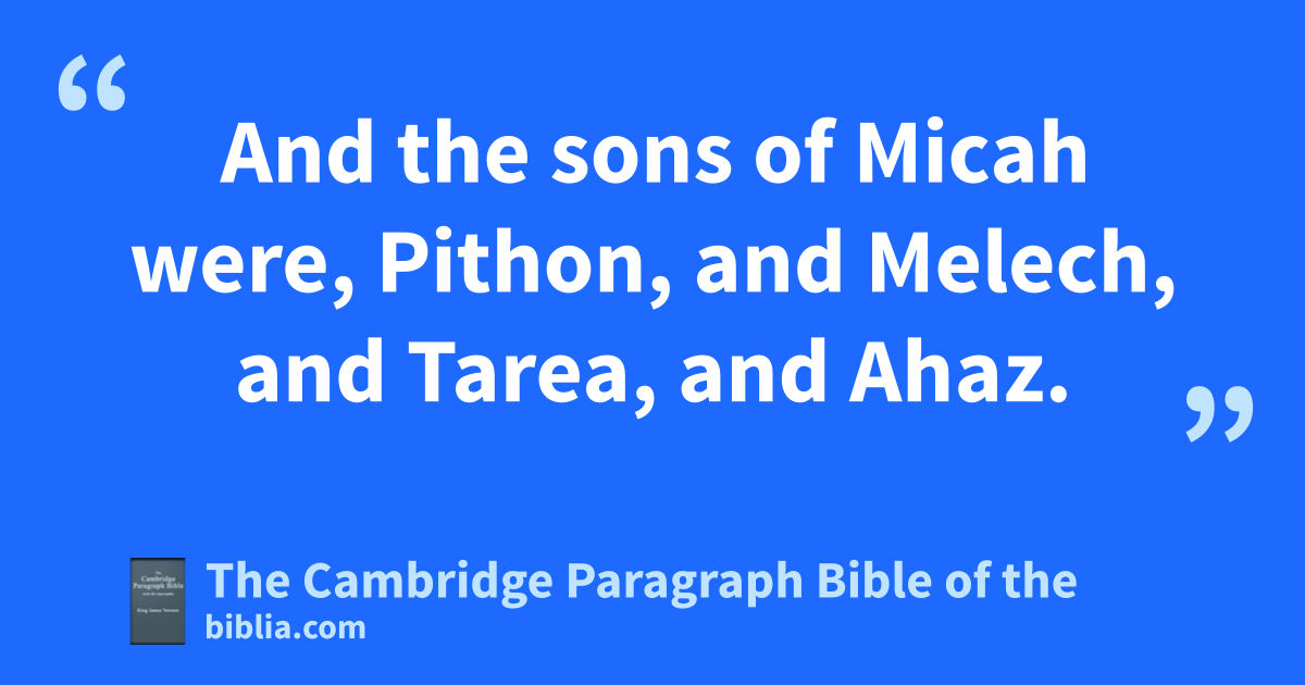 33 tAnd uNer begat Kish, and Kish begat Saul, and Saul begat Jonathan, and Malchishua, and x* Abinadab, and * Eshbaal. 34 And the son of Jonathan was * Merib-baal; and Merib-baal begat yMicah. 35 And the sons of Micah were, Pithon, and Melech, and * Tarea, and Ahaz. 36 And Ahaz begat * Jehoadah; and Jehoadah begat Alemeth, and Azmaveth, and Zimri; and Zimri begat Moza, 37 and Moza begat Binea: * Rapha was his son, Eleasah his son, Azel his son: 38 and Azel had six sons, whose names are these, Azrikam, Bocheru, and Ishmael, and Sheariah, and Obadiah, and Hanan. All these were the sons of Azel. 39 And the sons of Eshek his brother were, Ulam his firstborn, Jehush the second, and Eliphelet the third. 40 And the sons of Ulam were mighty men of valour, zarchers, and had many sons, and sons’ sons, an hundred and fifty. All these are of the sons of Benjamin.