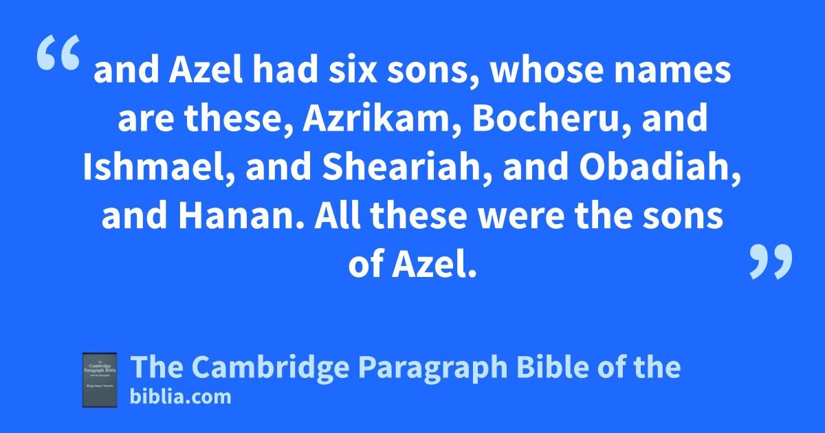 33 tAnd uNer begat Kish, and Kish begat Saul, and Saul begat Jonathan, and Malchishua, and x* Abinadab, and * Eshbaal. 34 And the son of Jonathan was * Merib-baal; and Merib-baal begat yMicah. 35 And the sons of Micah were, Pithon, and Melech, and * Tarea, and Ahaz. 36 And Ahaz begat * Jehoadah; and Jehoadah begat Alemeth, and Azmaveth, and Zimri; and Zimri begat Moza, 37 and Moza begat Binea: * Rapha was his son, Eleasah his son, Azel his son: 38 and Azel had six sons, whose names are these, Azrikam, Bocheru, and Ishmael, and Sheariah, and Obadiah, and Hanan. All these were the sons of Azel. 39 And the sons of Eshek his brother were, Ulam his firstborn, Jehush the second, and Eliphelet the third. 40 And the sons of Ulam were mighty men of valour, zarchers, and had many sons, and sons’ sons, an hundred and fifty. All these are of the sons of Benjamin.