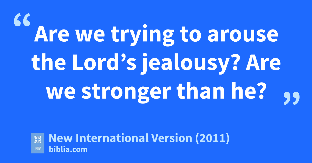 18 Consider the people of Israel: Do not those who eat the sacrificest participate in the altar? 19 Do I mean then that food sacrificed to an idol is anything, or that an idol is anything?u 20 No, but the sacrifices of pagans are offered to demons,v not to God, and I do not want you to be participants with demons. 21 You cannot drink the cup of the Lord and the cup of demons too; you cannot have a part in both the Lord’s table and the table of demons.w 22 Are we trying to arouse the Lord’s jealousy?x Are we stronger than he?y