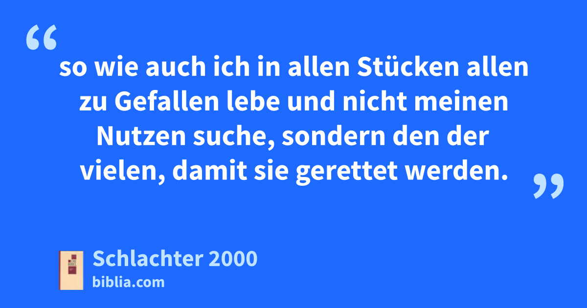 so wie auch ich in allen Stücken allen zu Gefallen lebe und nicht meinen Nutzen suche, sondern den der vielen, damit sie gerettet werden.