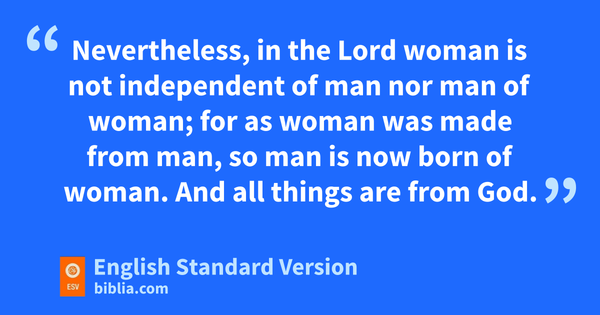 2 Now I commend you abecause you remember me in everything and bmaintain the traditions ceven as I delivered them to you. 3 But I want you to understand that dthe head of every man is Christ, ethe head of a wife1 is her husband,2 and fthe head of Christ is God. 4 Every man who prays or prophesies with his head covered dishonors his head, 5 but every wife3 who prays or gprophesies hwith her head uncovered dishonors her head, since it is the same ias if her head were shaven. 6 For if a wife will not cover her head, then she should cut her hair short. But since it is disgraceful for a wife to cut off her hair or shave her head, let her cover her head. 7 For a man ought not to cover his head, since jhe is the image and glory of God, but kwoman is the glory of man. 8 For lman was not made from woman, but woman from man. 9 Neither was man created for woman, but mwoman for man. 10 That is why a wife ought to have a symbol of authority on her head, because of the angels.4 11 Nevertheless, nin the Lord woman is not independent of man nor man of woman; 12 for as woman was made from man, so man is now born of woman. And oall things are from God. 13 Judge for yourselves: is it proper for a wife to pray to God with her head uncovered? 14 Does not nature itself teach you that if a man wears long hair it is a disgrace for him, 15 but if a woman has long hair, it is her glory? For her hair is given to her for a covering. 16 pIf anyone is inclined to be contentious, we have no such practice, nor do qthe churches of God.