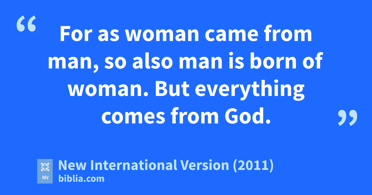 7 A man ought not to cover his head,b since he is the imagey and glory of God; but woman is the glory of man. 8 For man did not come from woman, but woman from man;z 9 neither was man created for woman, but woman for man.a 10 It is for this reason that a woman ought to have authority over her ownc head, because of the angels. 11 Nevertheless, in the Lord woman is not independent of man, nor is man independent of woman. 12 For as woman came from man, so also man is born of woman. But everything comes from God.b