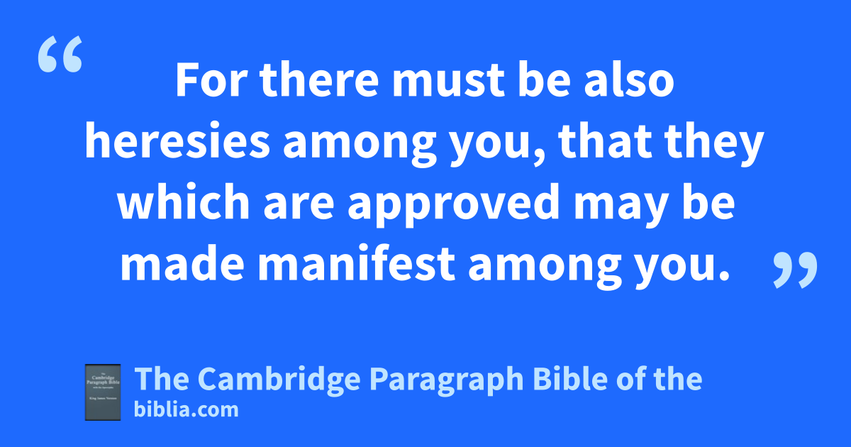17 Now in this that I declare unto you I praise you not, that you come together not for the better, but for the worse. 18 For first of all, when ye come together in the church, cI hear that there be * divisions among you; and I partly believe it. 19 For dthere must be also * eheresies among you, fthat they which are gapproved may be made manifest among you. 20 When ye come together therefore into one place, * this is not to eat hthe Lord’s supper. 21 For in eating every one rtaketh before other his own supper: and one is hungry, and ianother is drunken. 22 What? have ye not houses to eat and to drink in? or despise ye kthe church of God, and lshame * them that have not? What shall I say to you? shall I praise you in this? I praise you not. 23 For mI have received of the Lord that which also I delivered unto you, nThat the Lord Jesus the same night in which he was betrayed took bread: 24 and when he had given thanks, he obrake it, and said, Take, eat: this is my body, which is obroken for you: this do * in premembrance qof me. 25 After the same manner also he took the cup, rwhen he had supped, saying, This cup is the new testament in my blood: this do ye, as oft as ye drink it, in remembrance of me. 26 For as often as ye eat this bread, and drink this cup, * ye do shew the Lord’s death still he come. 27 Wherefore twhosoever shall eat this bread, and drink this cup of the Lord uunworthily, shall be wguilty of xthe body and blood of the Lord. 28 But ylet a man examine himself, and so let him eat of that bread, and drink of that cup. 29 For he that eateth and drinketh unworthily, eateth and drinketh * damnation to himself, not zdiscerning the Lord’s body. 30 For this cause many are weak and asickly among you, and many bsleep. 31 For cif we would djudge ourselves, we should not be judged. 32 But when we are judged, ewe are chastened of the Lord, that we should not be condemned with the world. 33 Wherefore, my brethren, when ye come together to eat, tarry one for another. 34 And fif any man hunger, let him geat at home; that hye come not together unto * condemnation. And the rest iwill I set in order kwhen I come.