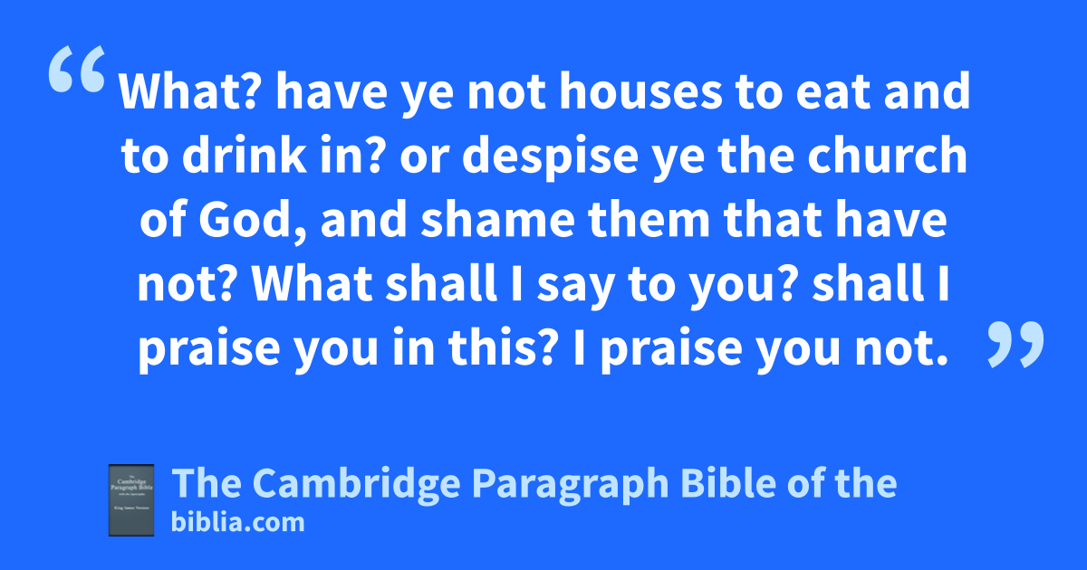 17 Now in this that I declare unto you I praise you not, that you come together not for the better, but for the worse. 18 For first of all, when ye come together in the church, cI hear that there be * divisions among you; and I partly believe it. 19 For dthere must be also * eheresies among you, fthat they which are gapproved may be made manifest among you. 20 When ye come together therefore into one place, * this is not to eat hthe Lord’s supper. 21 For in eating every one rtaketh before other his own supper: and one is hungry, and ianother is drunken. 22 What? have ye not houses to eat and to drink in? or despise ye kthe church of God, and lshame * them that have not? What shall I say to you? shall I praise you in this? I praise you not. 23 For mI have received of the Lord that which also I delivered unto you, nThat the Lord Jesus the same night in which he was betrayed took bread: 24 and when he had given thanks, he obrake it, and said, Take, eat: this is my body, which is obroken for you: this do * in premembrance qof me. 25 After the same manner also he took the cup, rwhen he had supped, saying, This cup is the new testament in my blood: this do ye, as oft as ye drink it, in remembrance of me. 26 For as often as ye eat this bread, and drink this cup, * ye do shew the Lord’s death still he come. 27 Wherefore twhosoever shall eat this bread, and drink this cup of the Lord uunworthily, shall be wguilty of xthe body and blood of the Lord. 28 But ylet a man examine himself, and so let him eat of that bread, and drink of that cup. 29 For he that eateth and drinketh unworthily, eateth and drinketh * damnation to himself, not zdiscerning the Lord’s body. 30 For this cause many are weak and asickly among you, and many bsleep. 31 For cif we would djudge ourselves, we should not be judged. 32 But when we are judged, ewe are chastened of the Lord, that we should not be condemned with the world. 33 Wherefore, my brethren, when ye come together to eat, tarry one for another. 34 And fif any man hunger, let him geat at home; that hye come not together unto * condemnation. And the rest iwill I set in order kwhen I come.