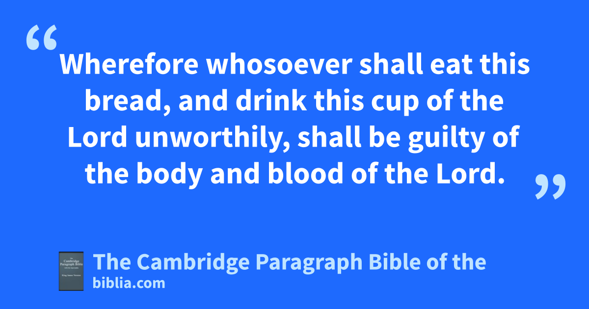 17 Now in this that I declare unto you I praise you not, that you come together not for the better, but for the worse. 18 For first of all, when ye come together in the church, cI hear that there be * divisions among you; and I partly believe it. 19 For dthere must be also * eheresies among you, fthat they which are gapproved may be made manifest among you. 20 When ye come together therefore into one place, * this is not to eat hthe Lord’s supper. 21 For in eating every one rtaketh before other his own supper: and one is hungry, and ianother is drunken. 22 What? have ye not houses to eat and to drink in? or despise ye kthe church of God, and lshame * them that have not? What shall I say to you? shall I praise you in this? I praise you not. 23 For mI have received of the Lord that which also I delivered unto you, nThat the Lord Jesus the same night in which he was betrayed took bread: 24 and when he had given thanks, he obrake it, and said, Take, eat: this is my body, which is obroken for you: this do * in premembrance qof me. 25 After the same manner also he took the cup, rwhen he had supped, saying, This cup is the new testament in my blood: this do ye, as oft as ye drink it, in remembrance of me. 26 For as often as ye eat this bread, and drink this cup, * ye do shew the Lord’s death still he come. 27 Wherefore twhosoever shall eat this bread, and drink this cup of the Lord uunworthily, shall be wguilty of xthe body and blood of the Lord. 28 But ylet a man examine himself, and so let him eat of that bread, and drink of that cup. 29 For he that eateth and drinketh unworthily, eateth and drinketh * damnation to himself, not zdiscerning the Lord’s body. 30 For this cause many are weak and asickly among you, and many bsleep. 31 For cif we would djudge ourselves, we should not be judged. 32 But when we are judged, ewe are chastened of the Lord, that we should not be condemned with the world. 33 Wherefore, my brethren, when ye come together to eat, tarry one for another. 34 And fif any man hunger, let him geat at home; that hye come not together unto * condemnation. And the rest iwill I set in order kwhen I come.