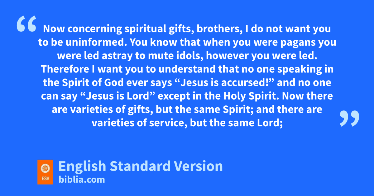 12 Now mconcerning1 spiritual gifts,2 brothers,3 I do not want you to be uninformed. 2 You know that nwhen you were pagans oyou were led astray to pmute idols, however you were led. 3 Therefore I want you to understand that qno one speaking in the Spirit of God ever says “Jesus is raccursed!” and sno one can say “Jesus is Lord” except in the Holy Spirit.