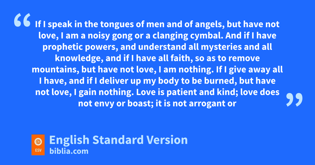 13 If I speak in the tongues of men and of angels, but have not love, I am a noisy gong or a clanging cymbal. 2 And if I have aprophetic powers, and understand all mysteries and all knowledge, and if I have all faith, bso as to remove mountains, but have not love, I am nothing. 3 cIf I give away all I have, and dif I deliver up my body to be burned,1 but have not love, I gain nothing.