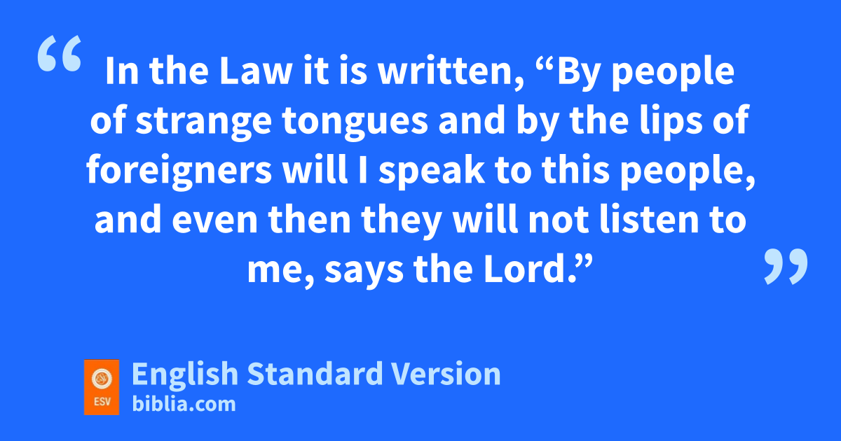 20 Brothers, hdo not be children in your thinking. iBe infants in evil, but in your thinking be jmature. 21 kIn the Law it is written, l“By people of strange tongues and by the lips of foreigners will I speak to this people, and even then they will not listen to me, says the Lord.” 22 Thus tongues are a sign not for believers but for unbelievers, while prophecy is a sign3 not for unbelievers but for believers. 23 If, therefore, the whole church comes together and all speak in tongues, and outsiders or unbelievers enter, mwill they not say that you are out of your minds? 24 But if all prophesy, and an unbeliever or outsider enters, he is convicted by all, he is called to account by all, 25 nthe secrets of his heart are disclosed, and so, ofalling on his face, he will worship God and pdeclare that God is really among you.