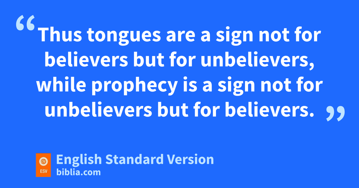 20 Brothers, hdo not be children in your thinking. iBe infants in evil, but in your thinking be jmature. 21 kIn the Law it is written, l“By people of strange tongues and by the lips of foreigners will I speak to this people, and even then they will not listen to me, says the Lord.” 22 Thus tongues are a sign not for believers but for unbelievers, while prophecy is a sign3 not for unbelievers but for believers. 23 If, therefore, the whole church comes together and all speak in tongues, and outsiders or unbelievers enter, mwill they not say that you are out of your minds? 24 But if all prophesy, and an unbeliever or outsider enters, he is convicted by all, he is called to account by all, 25 nthe secrets of his heart are disclosed, and so, ofalling on his face, he will worship God and pdeclare that God is really among you.