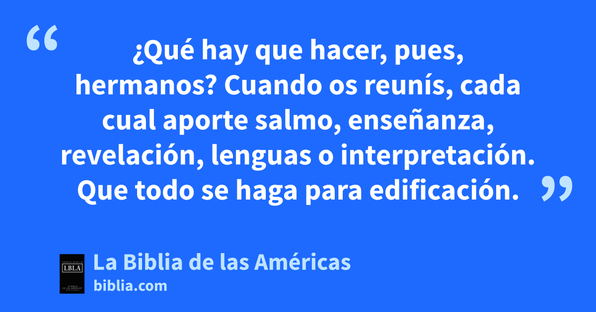 ¶26 ¿Quéa hay que hacer, pues, hermanosb? Cuando os reunís, cada cual aporte1 salmoc, enseñanza, revelaciónd, lenguase o interpretaciónf. Que todo se haga para edificacióng.