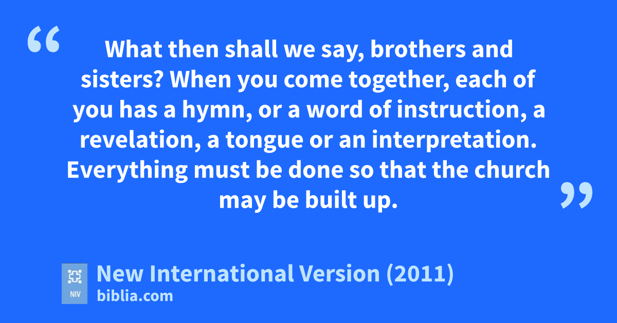 26 What then shall we say, brothers and sisters?y When you come together, each of youz has a hymn,a or a word of instruction,b a revelation, a tonguec or an interpretation.d Everything must be done so that the church may be built up.e 27 If anyone speaks in a tongue, two—or at the most three—should speak, one at a time, and someone must interpret. 28 If there is no interpreter, the speaker should keep quiet in the church and speak to himself and to God.
