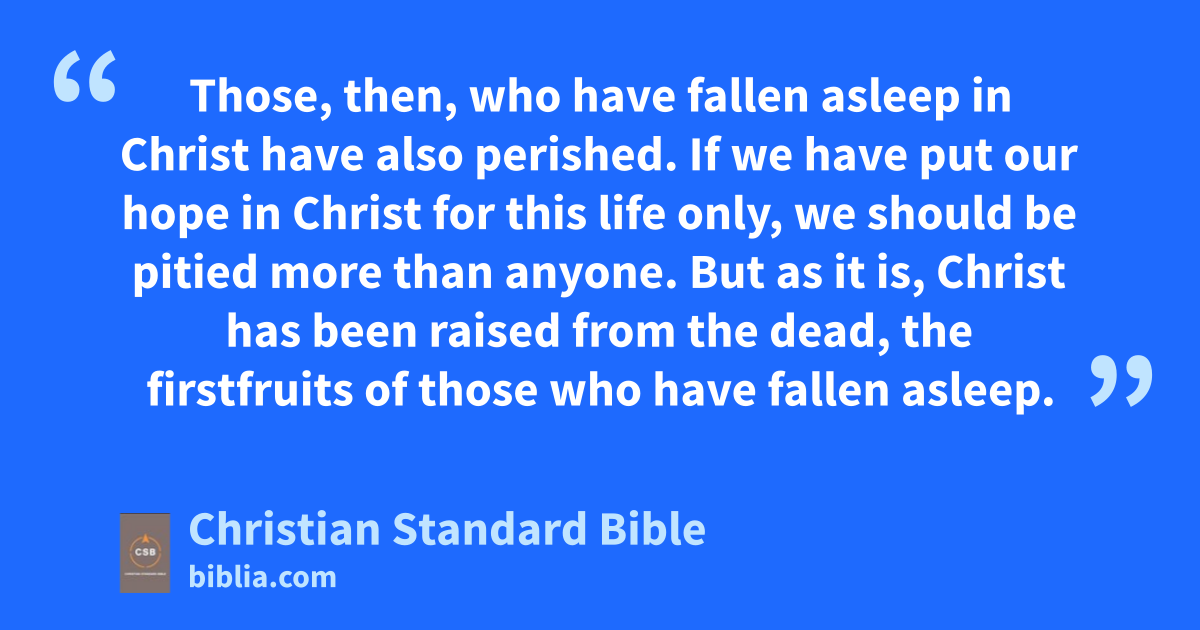 20 But as it is, Christ has been raised from the dead, the firstfruitsaa of those who have fallen asleep. 21 For since deathab came through a man,ac the resurrection of the dead also comes through a man.ad 22 For just as in Adam all die, so also in Christ all will be made alive.ae